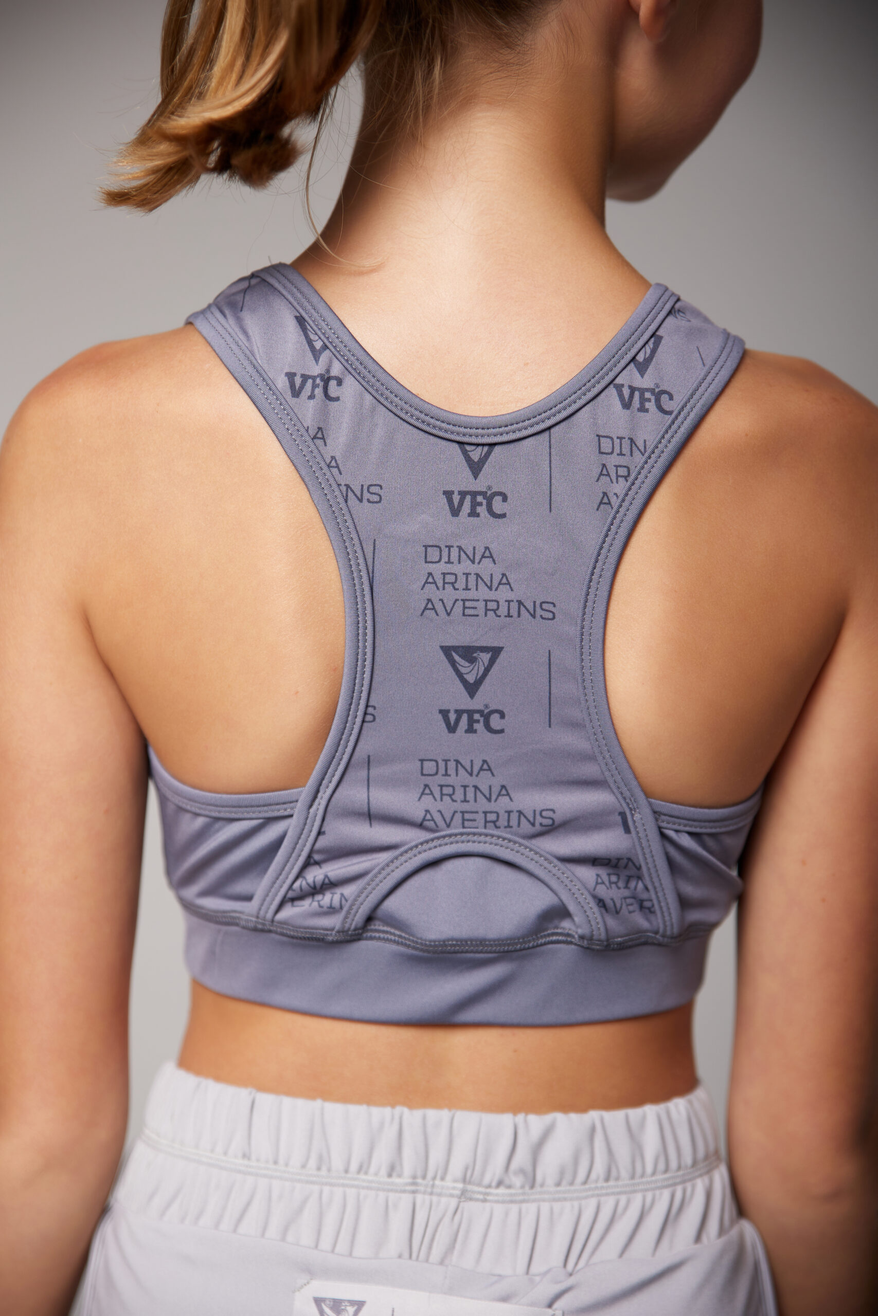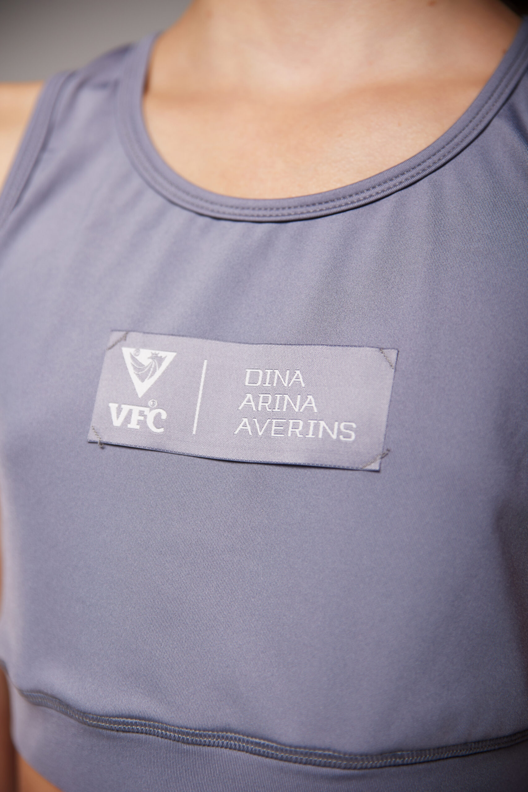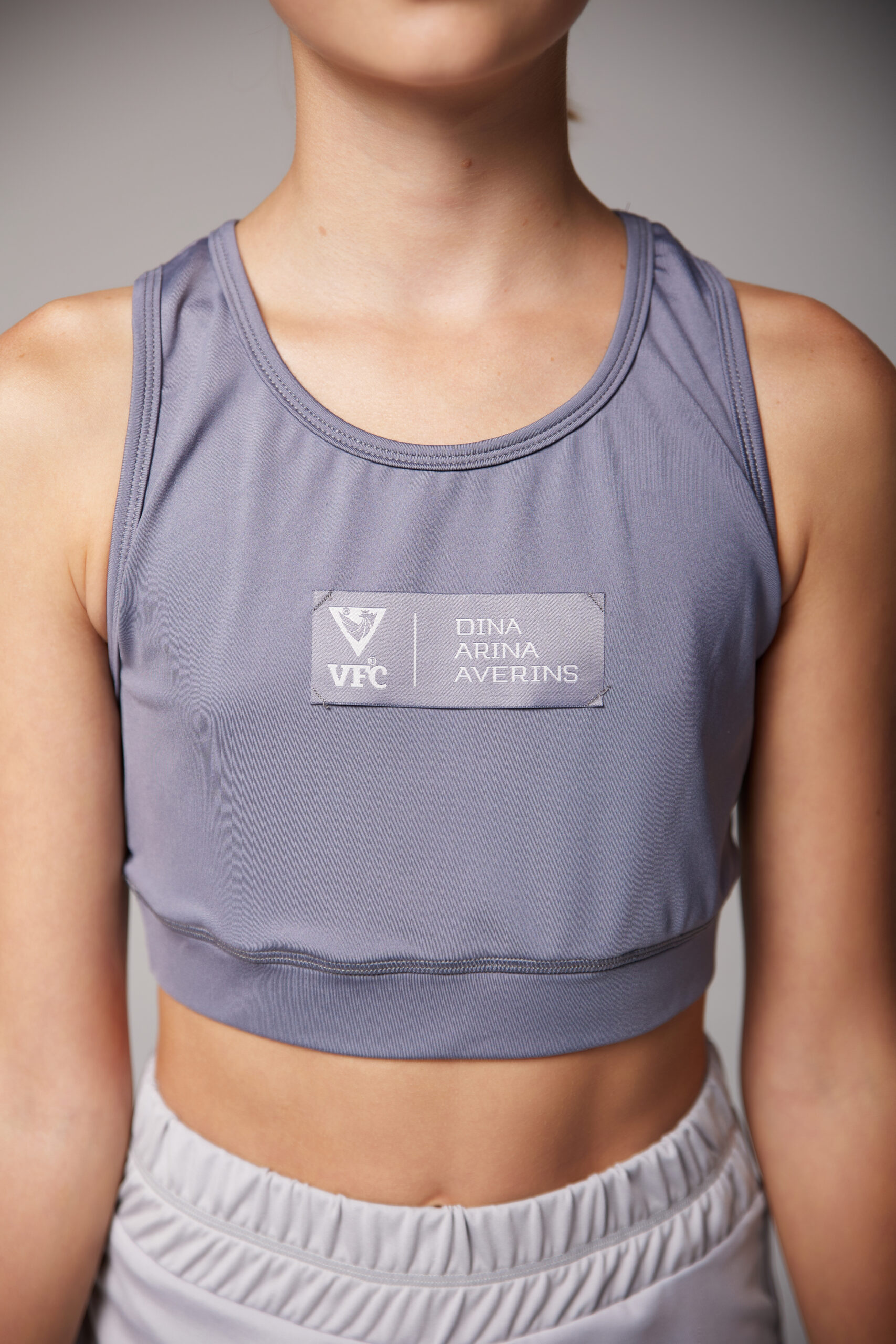 Топ средней длины из плотного светло-серого бифлекса. Отлично сочетается как с велосипедками так и двойными шортами для активных занятий спортом. Нанесение жаккардовый шеврон.
