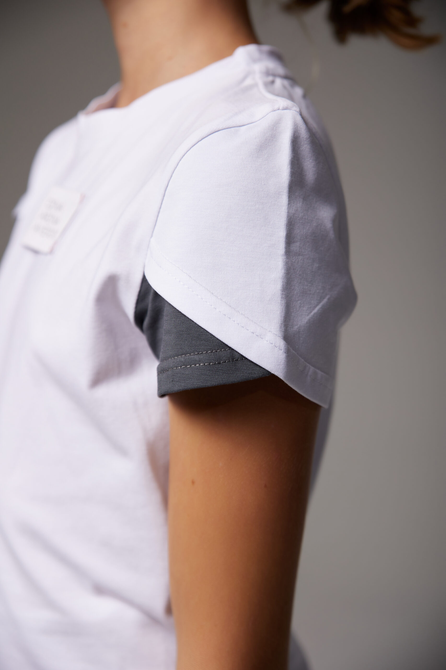 Футболка приталенная из плотного хлопка с добавлением лайкры. Отлично сочетается с велосипедками и двойными шортами. Нанесение DTF, жаккардовый шеврон.