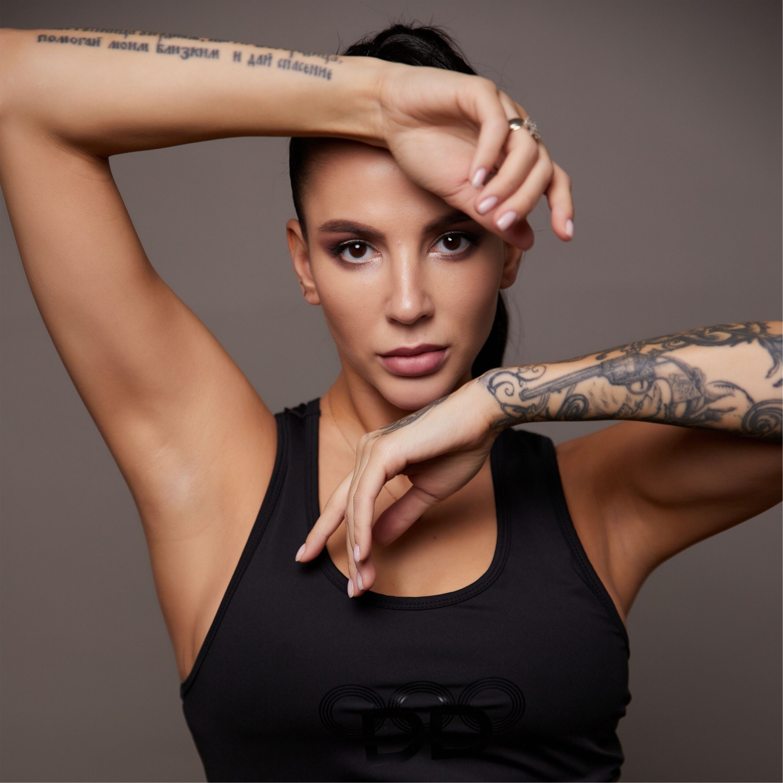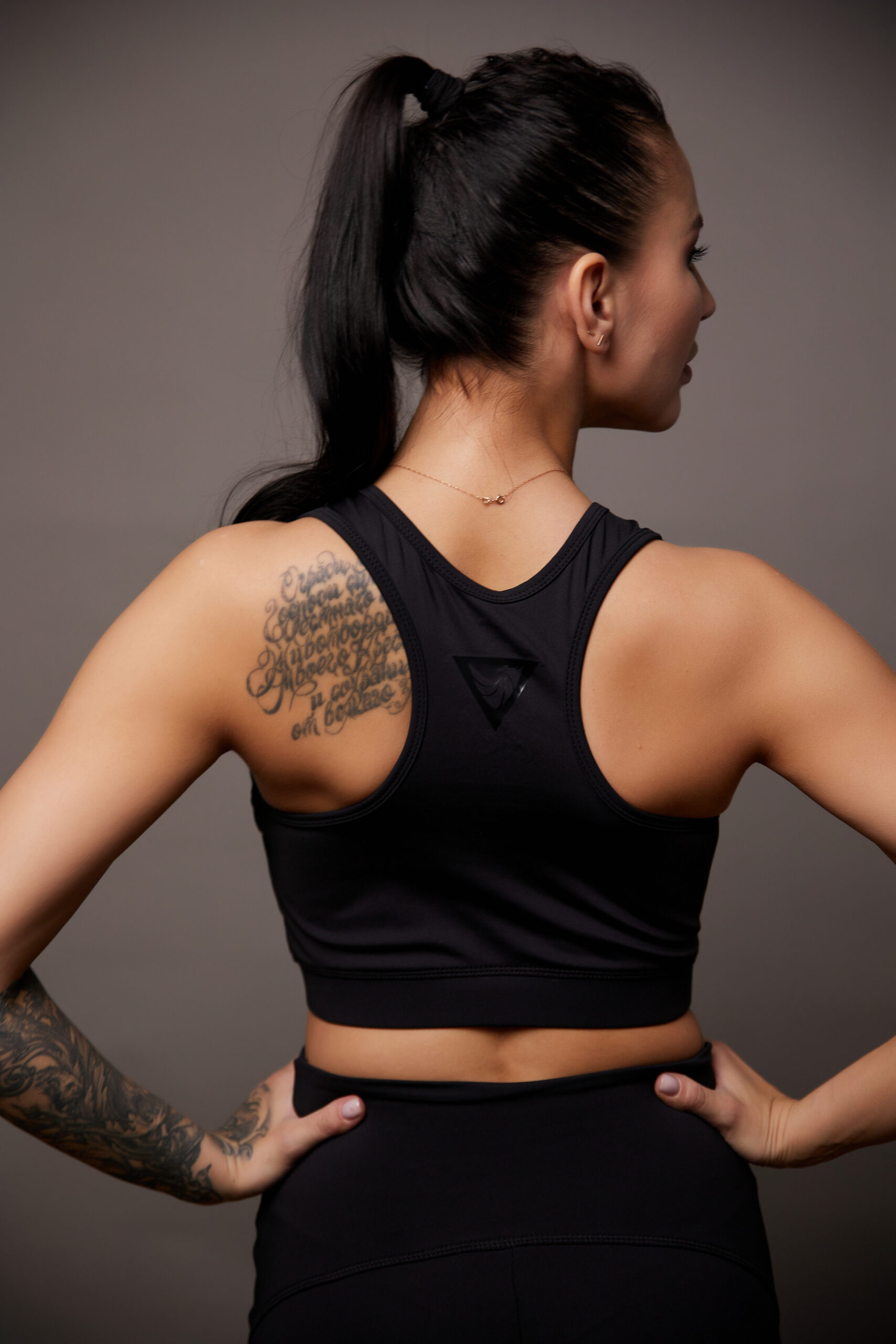 Топ черный высокого качества из полиэстера, с добавлением спандекса. Идеален для активного использования. Имеет черное термо-нанесение. Отлично комбинируется с лосинами и свитшотом.