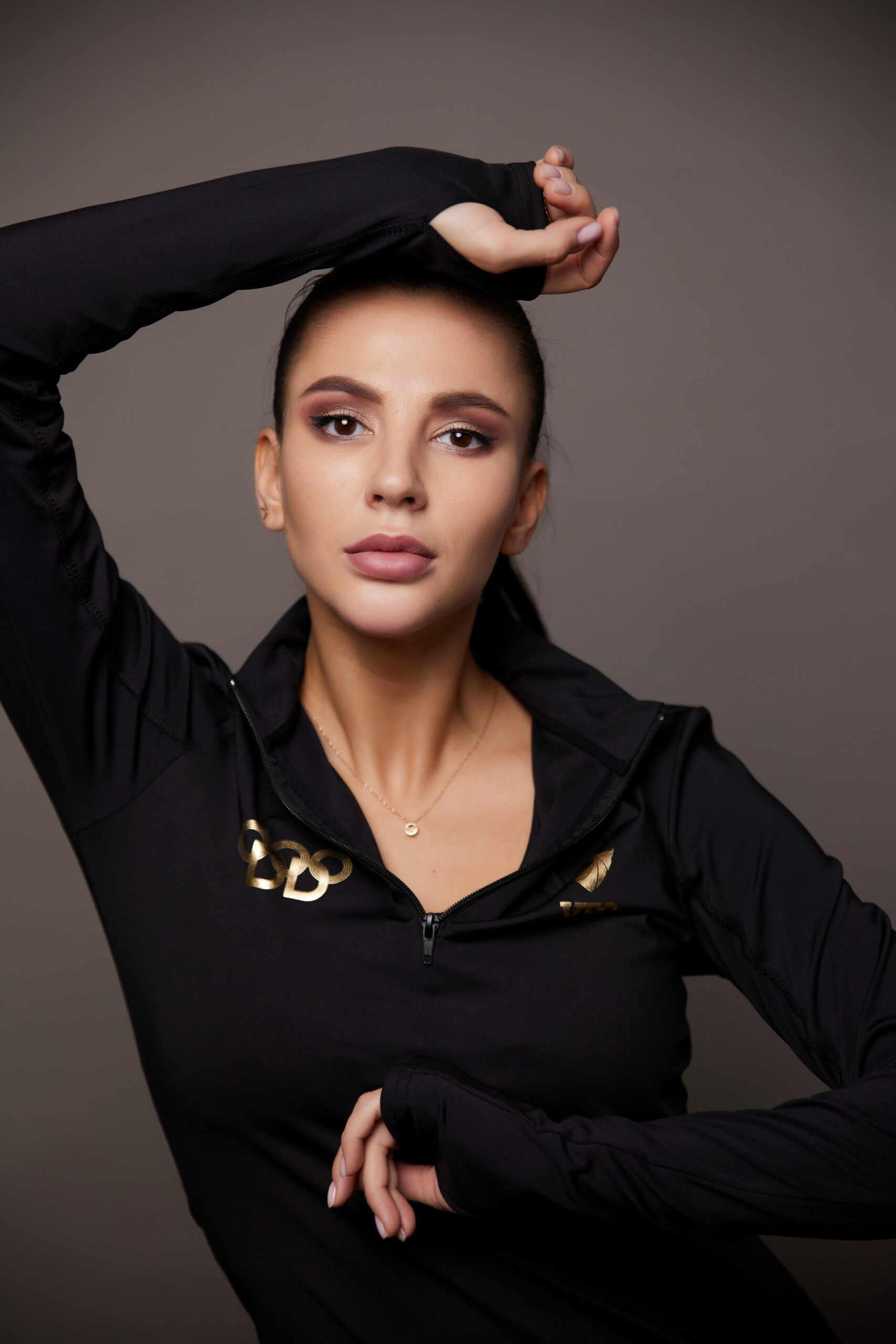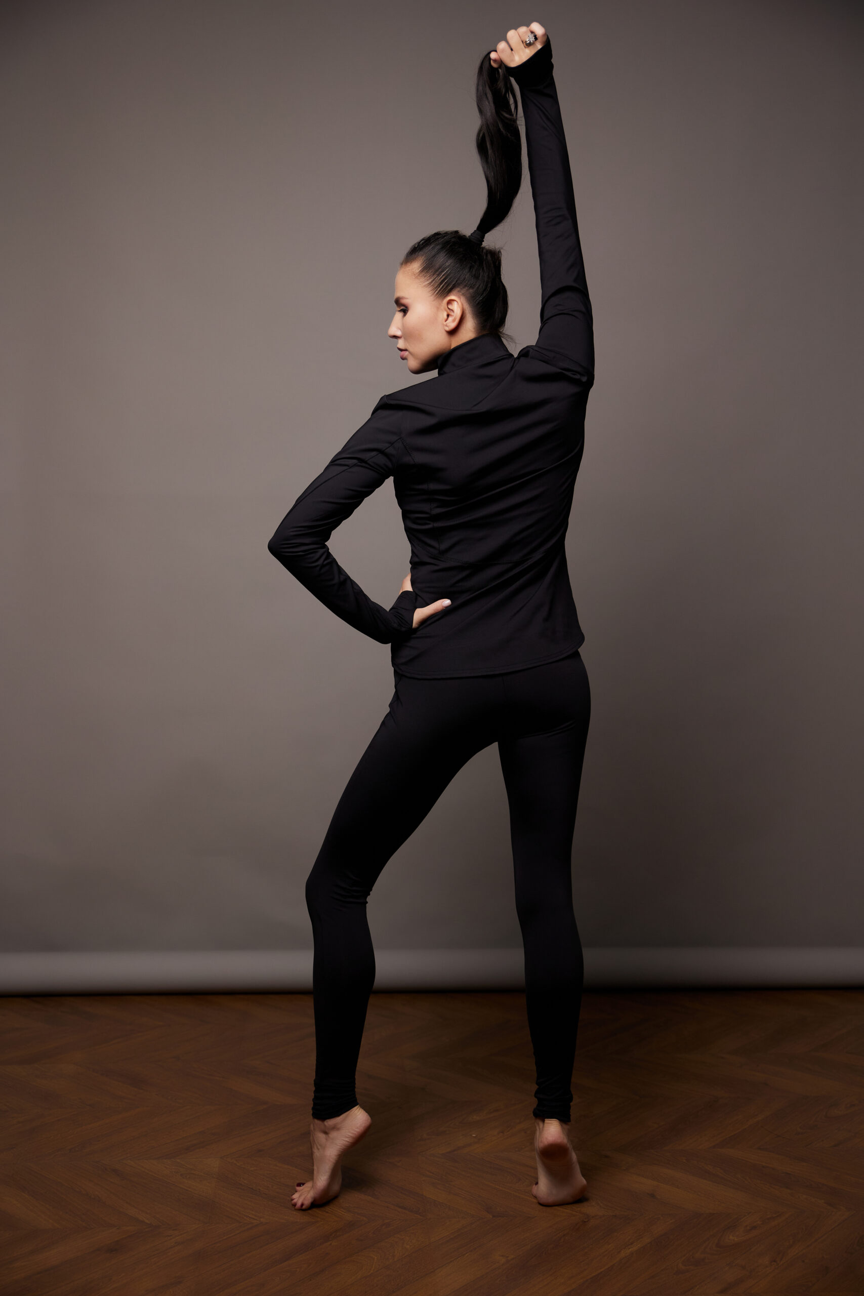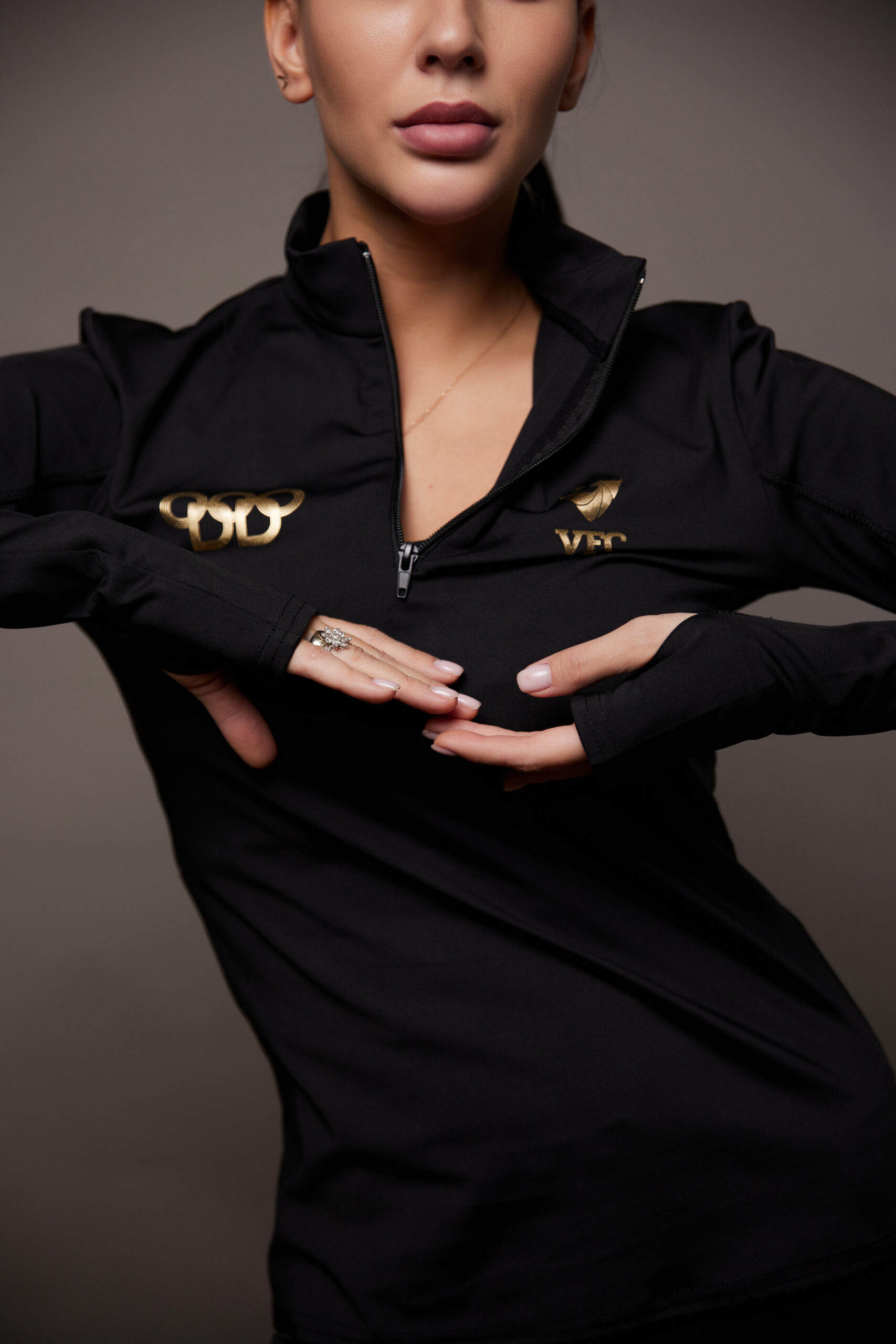 Лонгслив черный высокого качества из полиэстера, с добавлением спандекса. Модель чуть приталенного кроя. Идеален для активного использования. Имеет золотое термо-нанесение. Отлично комбинируется с лосинами.