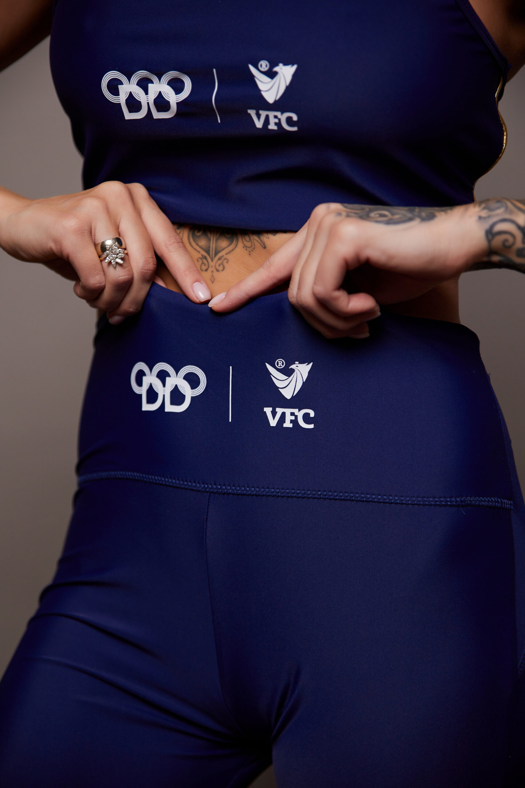 Лосины темно-синие высокого качества из полиэстера, с добавлением спандекса. Идеальны для активного использования. Имеет белое термо-нанесение. Отлично комбинируется с топом и свитшотом.