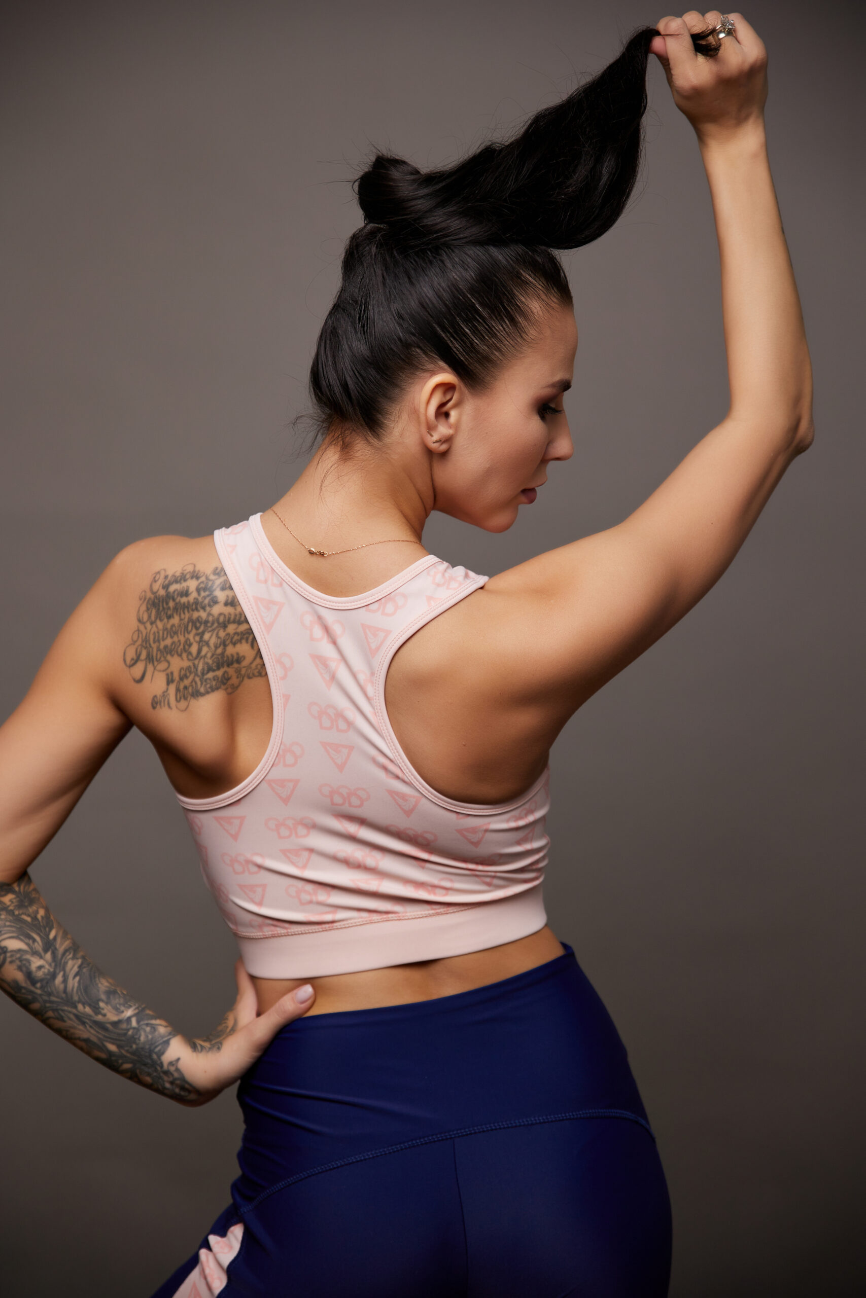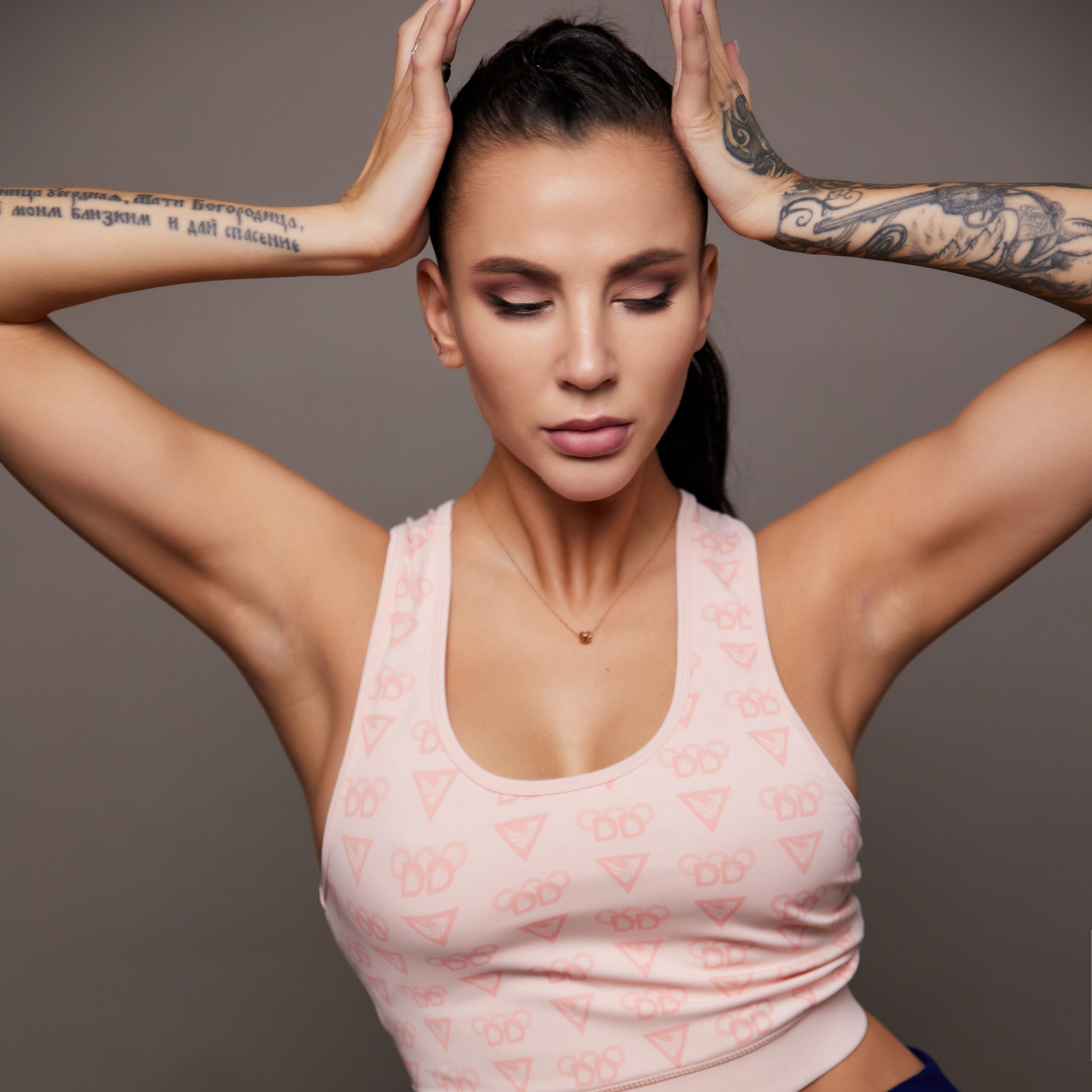Топ персиково-розовый высокого качества из полиэстера, с добавлением спандекса. Идеален для активного использования. Имеет нанесение сублимацией. Отлично комбинируется с лосинами и свитшотом.