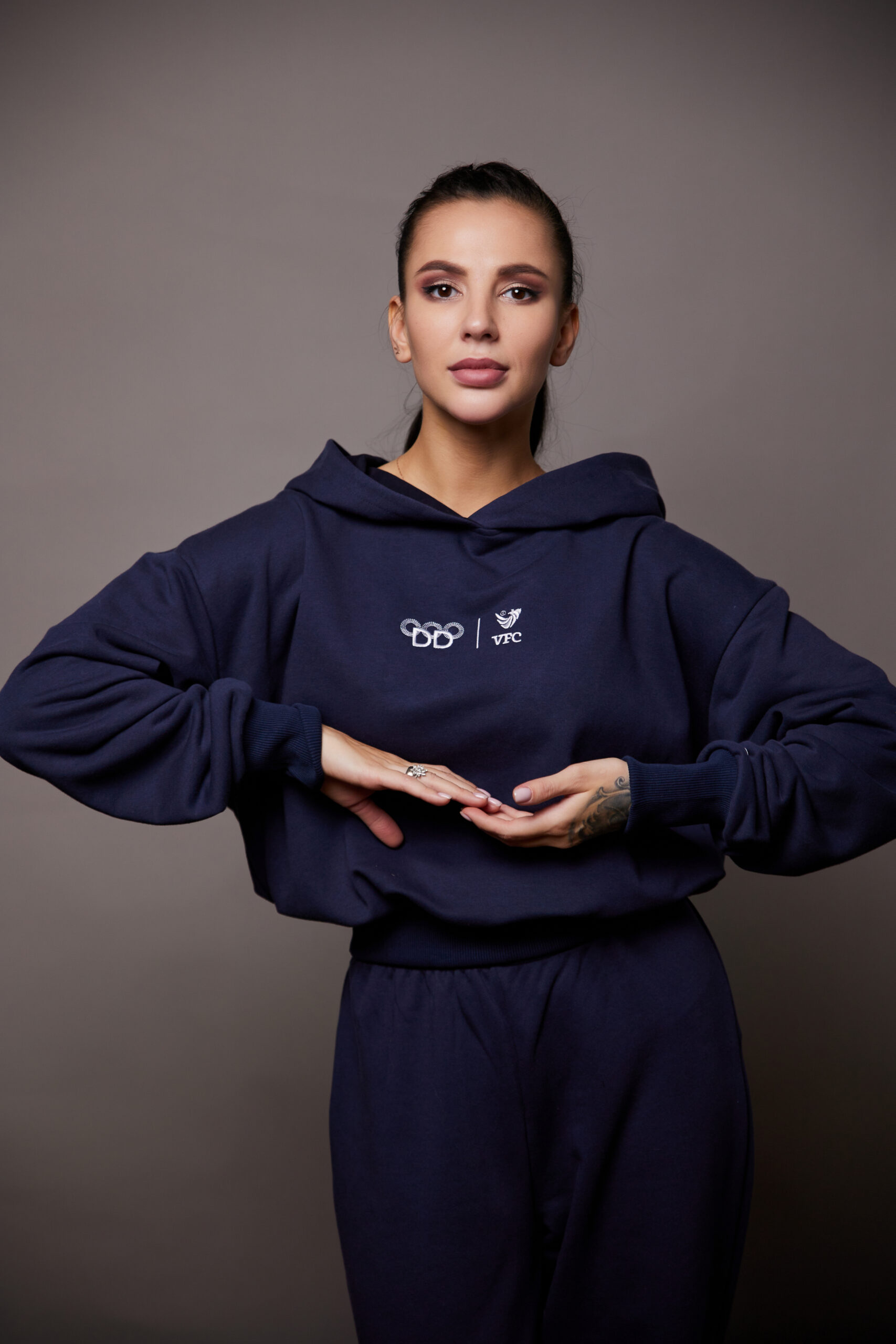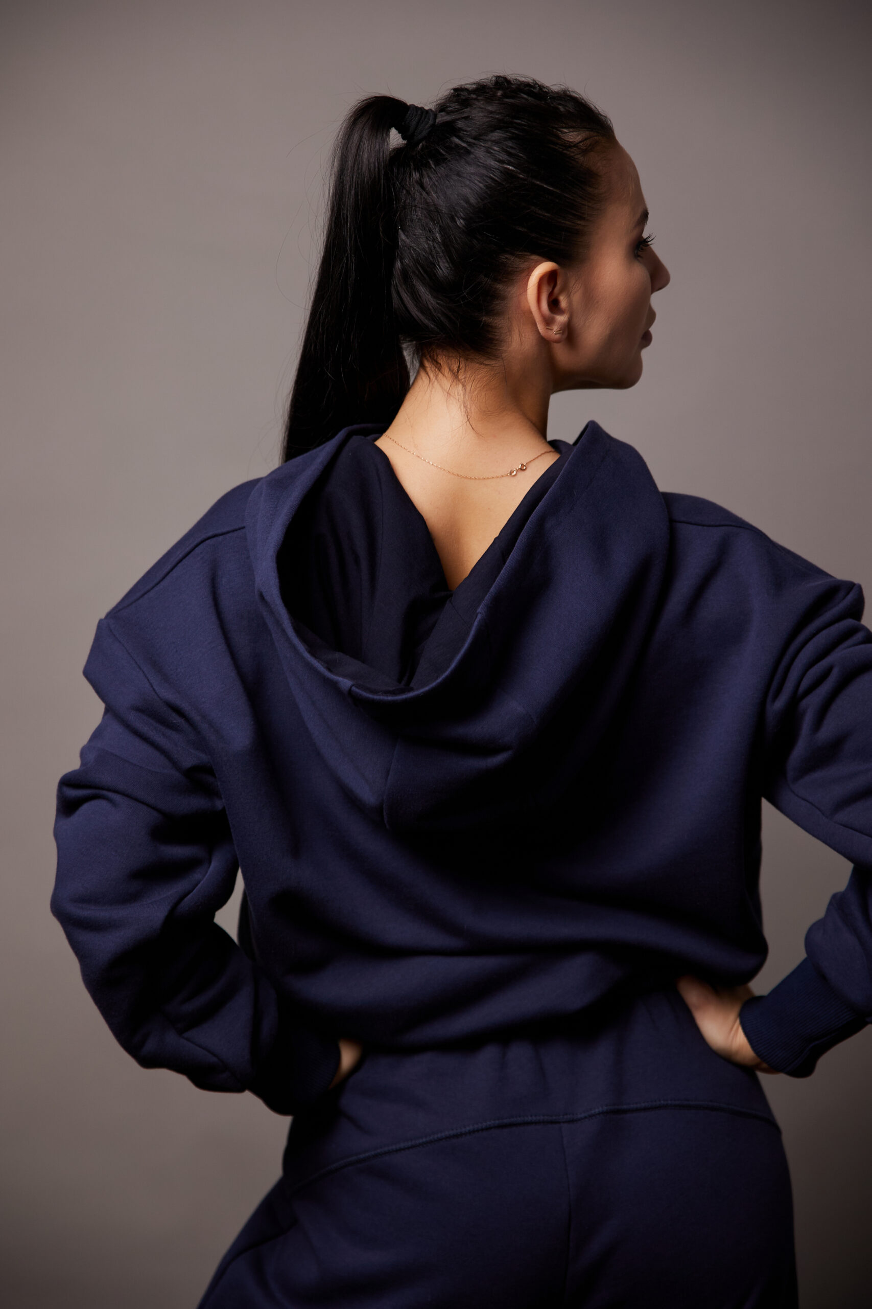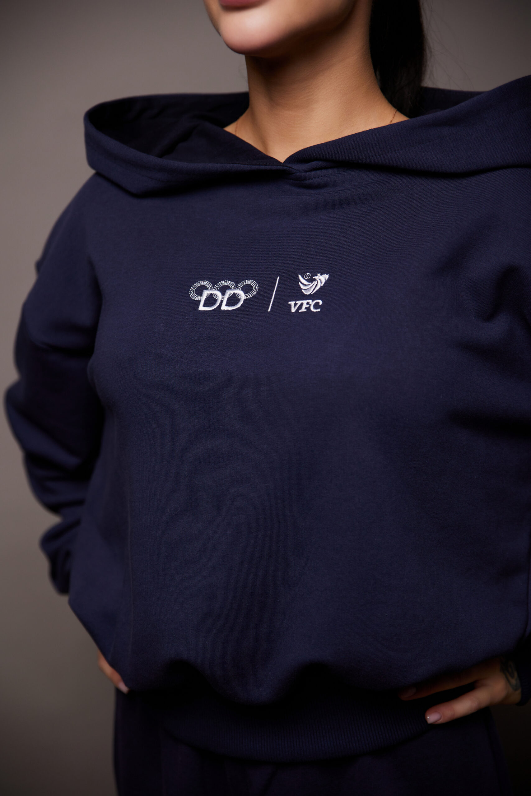 Костюм темно-синий высокого качества из хлопка, с добавлением полиэстера. Идеален для активного и повседневного использования. Имеет белое нанесение вышивкой. Для удобства длинные манжеты резинка-кашкорсе, удобный крой, увеличенный капюшон.