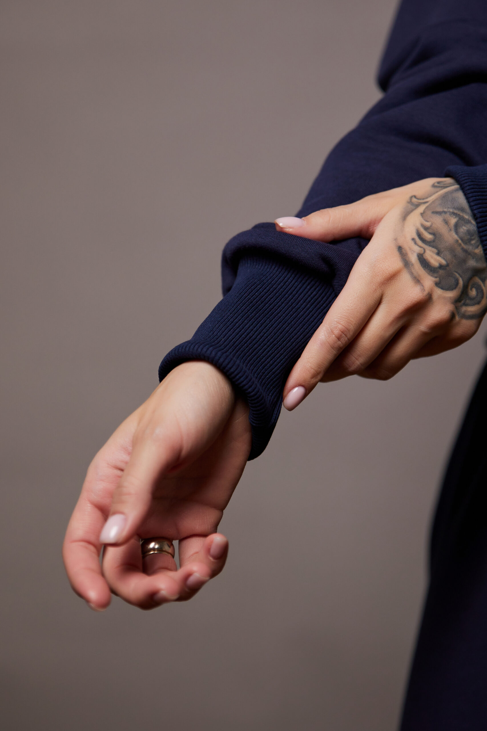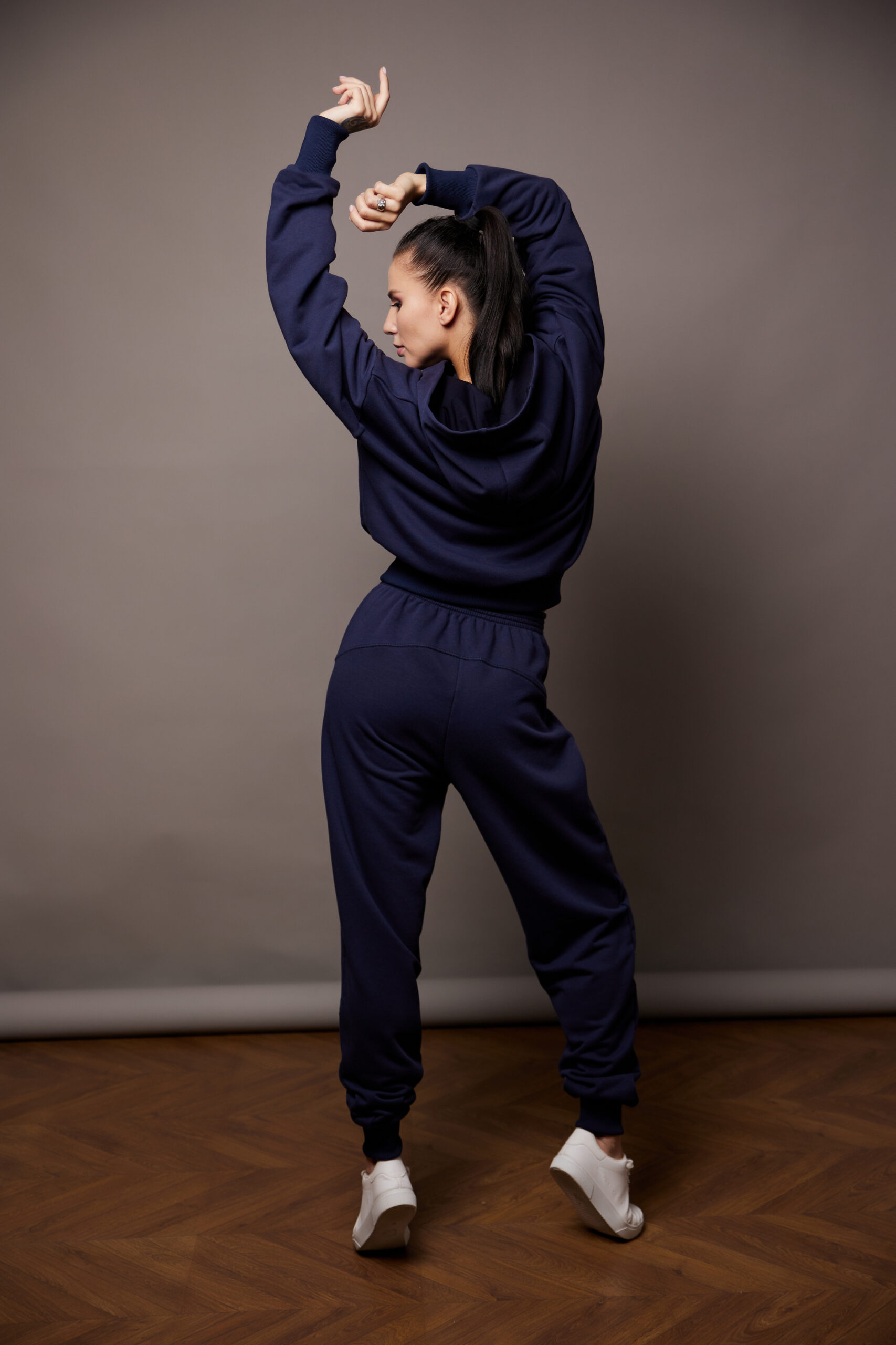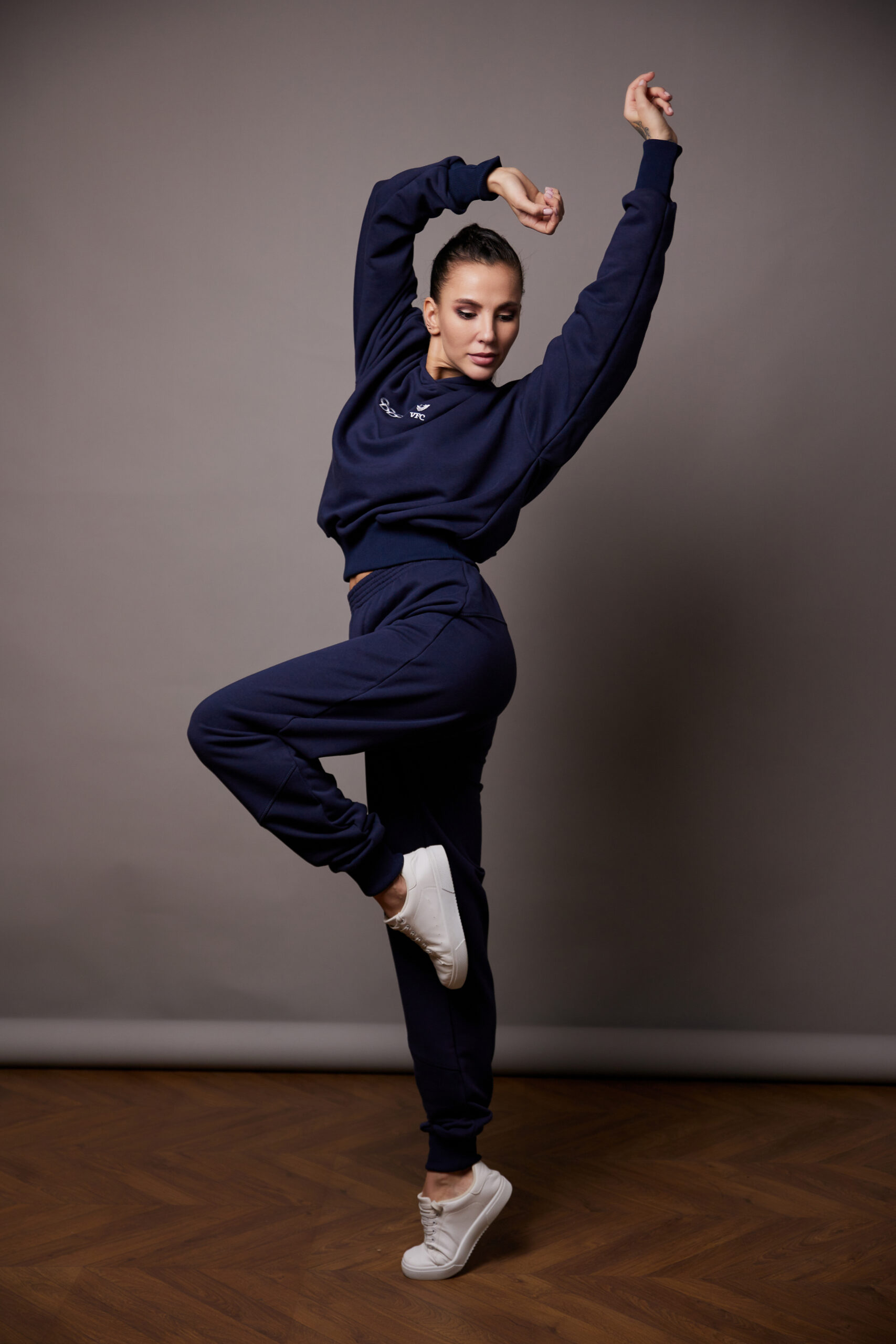 Костюм темно-синий высокого качества из хлопка, с добавлением полиэстера. Идеален для активного и повседневного использования. Имеет белое нанесение вышивкой. Для удобства длинные манжеты резинка-кашкорсе, удобный крой, увеличенный капюшон.