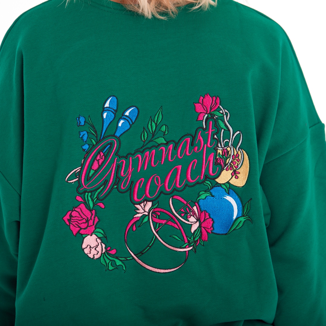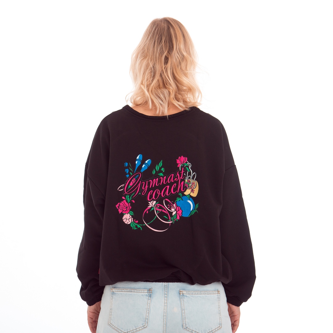 Толстовка – свитшот с вышивкой на спине “Gimnast coach” (“Gimnast mom”) отлично подойдет для повседневных прогулок, активного отдыха и физкультуры. Выполнена из мягкого и очень приятного к телу плотного трикотажа. Детали: – без капюшона, рукава и край толстовки с трикотажными манжетами, без карманов.